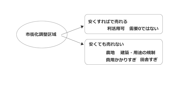 市街化調整区域は基本的に開発が進まない地域であるため、住宅地や商業地としての魅力が低く、購入希望者が少ないのです。