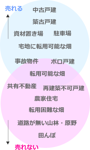 | 事故物件・ボロ戸建 | 事故物件やボロボロの戸建になってくると、だんだん売れなくなります。価格を安くして買う人がいれば‥という感じ。 |