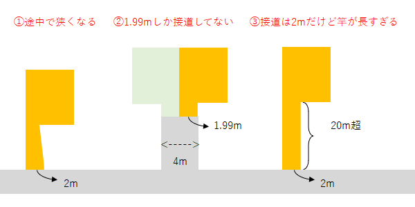 旗竿地の接道要件は自治体の条例で基準を設けていることがほとんどですので、確認するとよいです。単純に「2mあるから大丈夫」と言い切れないのが、旗竿地の難しさだと思います。