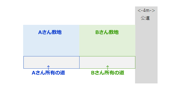 公道へ接道していない場合、隣地を借りるという方法で再建築することも可能な場合があります。下図のケースではAさんの敷地は道路と接道していないためBさん所有の道を借りて公道と接道という形で建築確認を取ることができます。